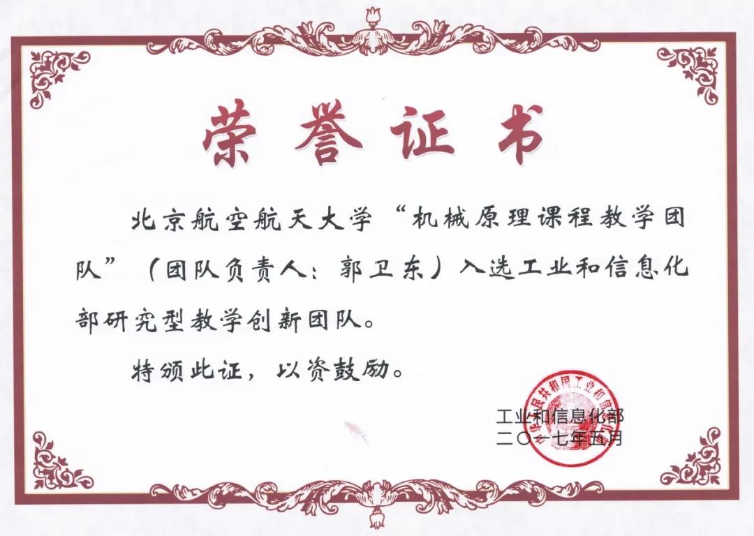 总之,深厚的历史积淀,相对较高的起点,使机械原理课程形成了一支学历层次高、师资结构合理、教学科研并重且相互促进、团结协作、甘于奉献的高水平“机械原理”课程教学团队。2017年获得工信部“研究型创新教学团队”称号。
