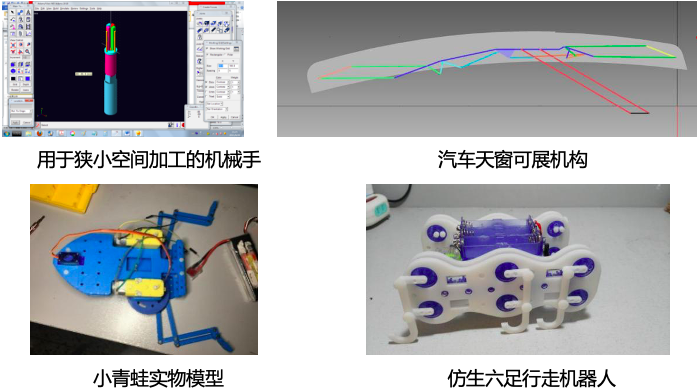 2)实践项目II(小组):仿生机构设计。自选设计题目,完成机构或机械系统的概念设计,建立虚拟样机模型进行仿真验证,研制实物样机模型进行功能验证(图3.24),撰写研究报告。(整个学期,第6周开题答辩、第12周中期答辩、第16周结题答辩)实践表明,项目实践教学环节有效地提升了学生的多方面能力,包括使用现代工具解决工程问题的能力,设计实验(项目)的能力、动手实践的能力、团队合作交流的能力等。