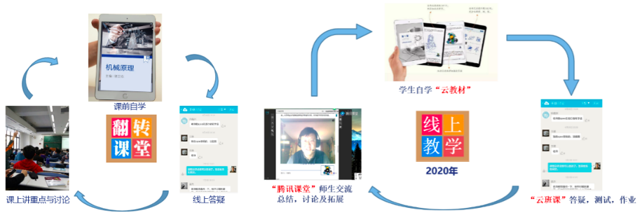 2)基于开展多种形式的翻转课堂实践。2015年春季学期,首次开展“翻转课堂”教学试点(图15):课前学生在“中国大学MOOC”上进行学习,课堂上讨论与问题探究,并拓展有关知识,效果良好[8]。2016年春季学期,进一步进行了基于“云教材”+“云班课”的形式“翻转课堂”教学试点(图16)。基于“MOOC”和“云教材 +云班课”的翻转课堂,为教师的研究型教学和学生的研究型学习奠定了扎实的基础,精心设计的探索问题,为研究型教学和学习的开展创造了切实可行的范例。2020年春季学期,受新冠疫情影响,课程全面应用“腾讯课堂”替代教室课堂,部分班级沿用了“云教材 +云班课”的教学模式,取得理想的教学效果。教学团队承担的另外一门课程“机械原理及设计”在2020年春季学期,采用了“腾讯课堂(直播)+SPOC+慕课堂”的教学模式(图17)。问卷调查表明,学生普遍认同和接受这样的教学模式和教学方法,并能很好地锻炼学生的自主学习能力。