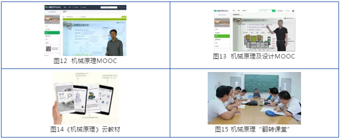 1)大力加强MOOC课程及云课程资源建设。2015年9月,“机械原理”课程开始在“爱课程(中国大学MOOC)”平台上线开课(图12)。此后,在中国大学MOOC又先后上线开课了“机械原理学习指导与习题解析”和“机械原理及设计”MOOC课程(图13)。在“机械原理MOOC”的基础上,2016年出版国内首部《机械原理》云教材(图14),同时创建了国内首个机械原理“云班课”。