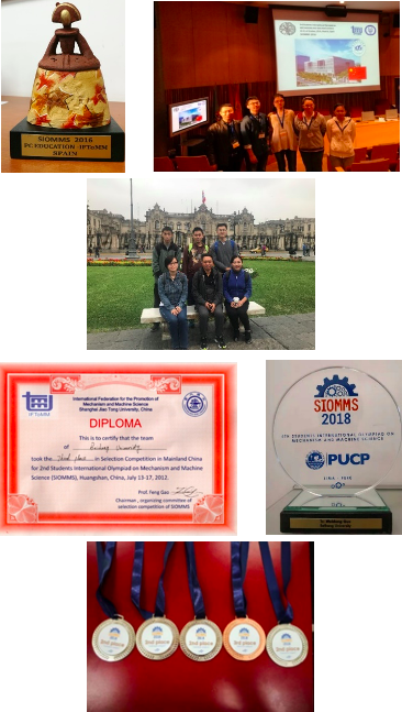 课程团队在学校的大力支持下,成立了“大学生国际机器人机构与机构学奥林匹克竞赛(SIOMMS)”参赛队,连续参加了第2~4届竞赛(2013,中国上海;2016,西班牙马德里;2018,秘鲁利马),在培养了学生机构的创新设计能力的同时,极大地开阔了学生的国际视野,培养了他们在国际舞台沟通交流的能力。其中,第四届国际机构和机器科学大学生奥林匹克竞赛中获得团体亚军,个人亚军和个人季军(图3.25)。同时,团队负责人等作为北航“机械创新基地”教练,组织和规划学生参加了多届的“全国大学生机械创新设计大赛”和“首都高校机械创新设计大赛”,并作为指导教师,指导20余项作品参加竞赛(图26),取得优良成绩。