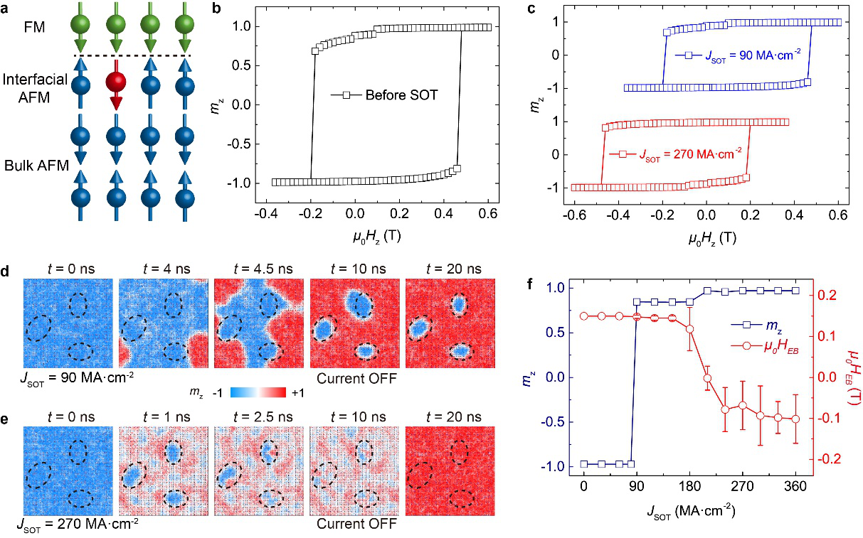 图2:自旋轨道矩驱动交换偏置场翻转的微磁仿真结果。a. 反铁磁/铁磁界面结构示意图。b.初始状态的磁滞回线。c. 施加不同自旋轨道矩电流后的磁滞回线。d,e. 不同自旋轨道矩电流驱动下的铁磁层磁矩随时间变化情况。f. 自旋轨道矩电流驱动铁磁层磁矩和交换偏置场翻转结果。