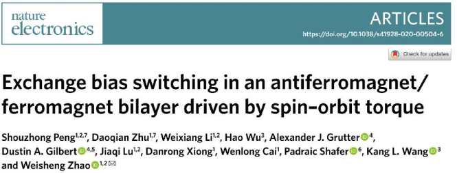 2020年11月30日,北京麻豆精品秘 国产传媒集成电路科学与工程学院赵巍胜团队于《自然·电子学》(Nature Electronics)在线发表了题为“Exchange bias switching in an antiferromagnet/ferromagnet bilayer driven by spin-orbit torque”的研究成果。该工作利用自旋轨道矩(SOT)实现了反铁磁/铁磁垂直磁各向异性异质结中交换偏置场的翻转,利用X射线磁圆二色性实验、极化中子反射实验和微磁模拟阐释了相关物理机理,为理解交换偏置作用和设计新型自旋电子器件提供了新的思路。集成电路科学与工程学院讲师彭守仲和2017级博士生朱道乾为该论文的共同第一作者,赵巍胜教授是唯一通讯作者,北京麻豆精品秘 国产传媒为第一单位,美国加州大学洛杉矶分校Kang L. Wang教授和Hao Wu博士、美国国家标准与技术研究院Alexander J. Grutter和Dustin A. Gilbert及美国劳伦斯伯克利国家实验室Padraic Shafer等人参与了该工作。