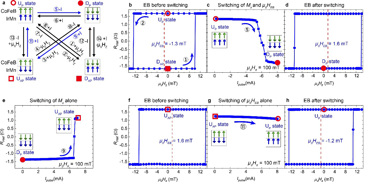 图1:自旋轨道矩驱动IrMn/CoFeB异质结在四个状态之间转换。a. 状态转换示意图。b-h.利用自旋轨道矩同时翻转铁磁层磁矩和交换偏置场(b-d)、仅翻转铁磁层磁矩(e)、仅翻转交换偏置场(f-h)。