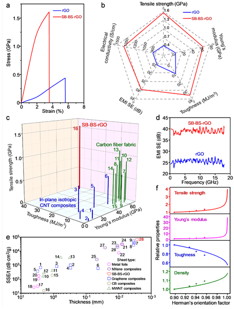 石墨烯纳米片取向度和堆积密实度的提高,以及较强的层间界面相互作用,构筑的石墨烯薄膜(SB-BS-rGO)相比于纯rGO薄膜具有更高的力学和电学性能(图3a、b),其拉伸强度高达1.55 GPa、杨氏模量为64.5 GPa、韧性为35.9 MJ/m3、电导率为1394 S/cm、电磁屏蔽系数为39.0 dB(薄膜厚度2.8 μm),分别是rGO薄膜的3.6、10.6、3.3、1.5和1.5倍。该石墨烯(SB-BS-rGO)薄膜的拉伸强度和韧性远超面内准各向同性的商用碳纤维织物复合材料(图3c);此外,相比于碳纤维复合材料,该SB-BS-rGO薄膜(制备过程的温度低于50ºC)的制备成本较低,且原料(石墨)廉价易得,有望代替商用碳纤维织物复合材料用于汽车和航空飞行器等。同时,该SB-BS-rGO薄膜的比电磁屏蔽效能优于目前文献报道的大多数实心屏蔽材料(图3e)。通过改变外力的大小,可以调节该SB-BS-rGO薄膜的取向度,进而优化其性能。如图3f所示,随着取向度的增加,该SB-BS-rGO薄膜的拉伸强度、杨氏模量和密度逐渐提升,而韧性逐渐降低,这与理论模拟预测结果保持一致。