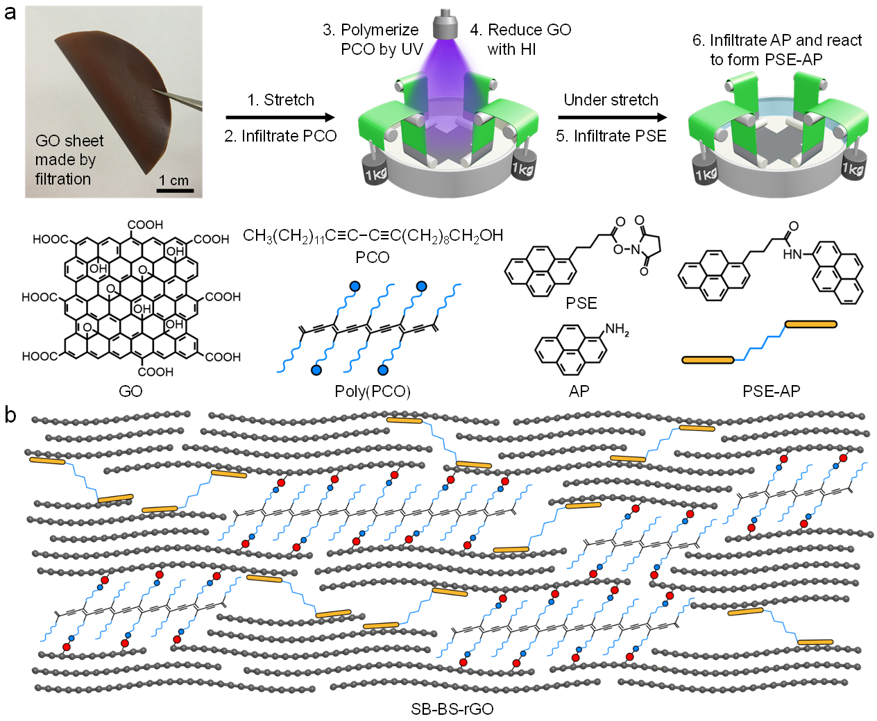 鉴于此,程群峰教授课题组和Ray H. Baughman院士团队提出了外力牵引下有序界面交联的新型组装策略(图1a),揭示了界面交联“冻结”外力牵引诱导取向结构的科学原理,解决了石墨烯纳米片组装过程中的两个关键科学问题,制备了高强度高导电的石墨烯薄膜(图1b)。这种新型构筑策略为其他二维纳米片的宏观组装提供了新的研究思路。