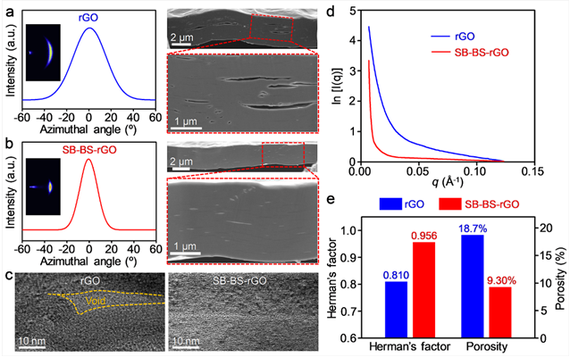 研究团队首先通过离子束切割组装的还原氧化石墨烯(rGO)薄膜,发现其内部呈现多孔、褶皱结构(图2a、c),导致石墨烯薄膜的性能较低。其次,虽然单纯的外力牵引可以在一定程度上降低石墨烯纳米片的褶皱、提升其规整取向度,但是当外力卸载时,诱导取向的结构会发生部分回弹,从而在一定程度上降低了取向度。因此,我们提出在外力牵引下有序界面交联,实现“冻结”此结构,进而提升石墨烯薄膜的规整取向度和密实度。如图2b、c所示,石墨烯(SB-BS-rGO)薄膜内的石墨烯纳米片规整排列、密实堆积。此外,广角和小角X-射线衍射表征(图2d、e)进一步证实了上述结构。