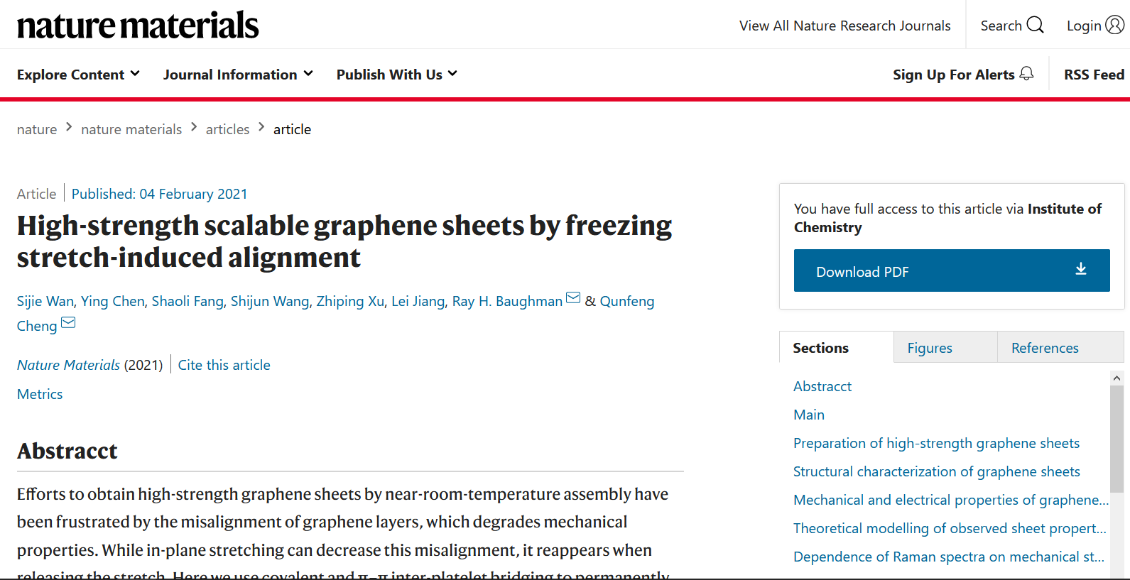 2021年2月4日,《Nature Materials》以在线全文Article的形式发表了我校化学学院江雷院士团队程群峰教授课题组与美国德克萨斯大学达拉斯分校Ray H. Baughman院士团队在仿生高性能石墨烯薄膜方面的最新研究成果“High-strength scalable graphene sheets by freezing stretch-induced alignment”。北航卓百博士后万思杰博士、陈英博士、房少立教授为第一作者,Ray H. Baughman院士和程群峰教授为通讯作者,北京麻豆精品秘 国产传媒化学学院为第一完成单位。