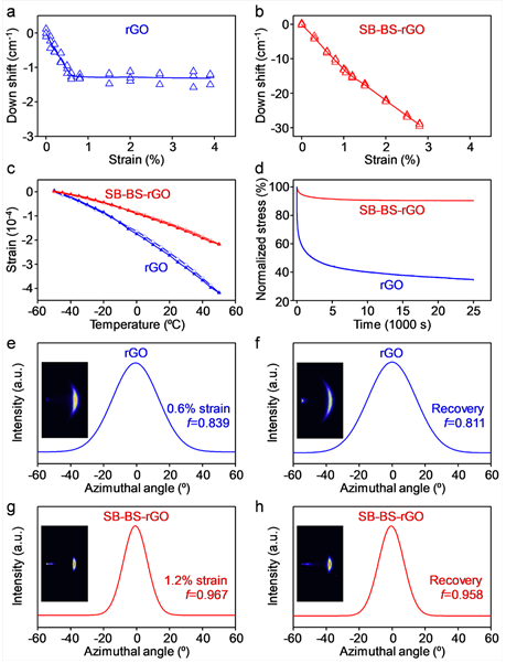 原位拉曼测试结果(图4a、b)表明,在受力拉伸时,SB-BS-rGO薄膜相比于rGO薄膜具有更高效的应力传递效率。此外,由于密实结构限制了石墨烯纳米片的面外变形,因此,SB-BS-rGO薄膜相比于rGO薄膜具有更低的负热膨胀系数(图4c)。这种高取向密实化结构和较强的界面作用也赋予SB-BS-rGO薄膜更强的抗应力松弛能力(图4d)以及更小的取向度对弹性应变的变化率(图4e-h)。