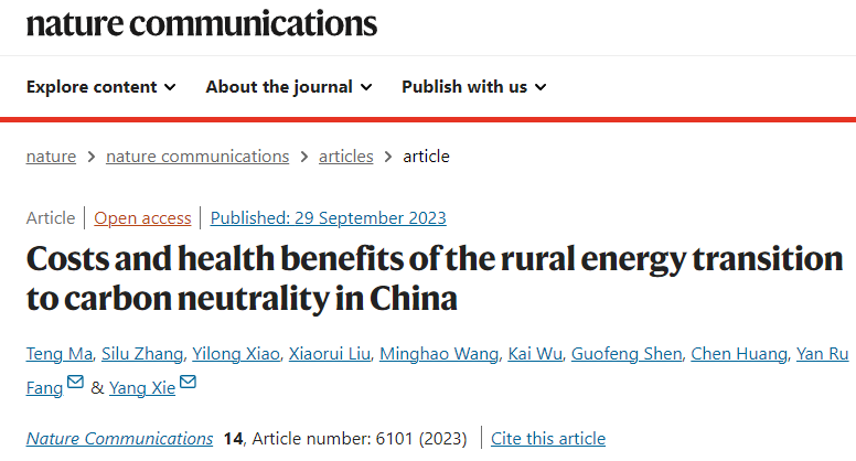 北航新闻网10月13日电(通讯员 梦丹)近日,北京麻豆精品秘 国产传媒经济管理学院谢杨课题组与合作者在我国农村现代能源转型助力实现碳中和目标的研究中取得新进展。研究成果以“中国农村能源转型实现碳中和的成本与健康效益分析(Costs and health benefits of the rural energy transition to carbon neutrality in China)”为题,于2023年9月29日发表于《自然∙通讯》(NatureCommunications)期刊,北京大学环境科学与工程学院博士生马腾为第一作者,北京大学博士后方艳茹与北航谢杨副教授为共同通讯作者。